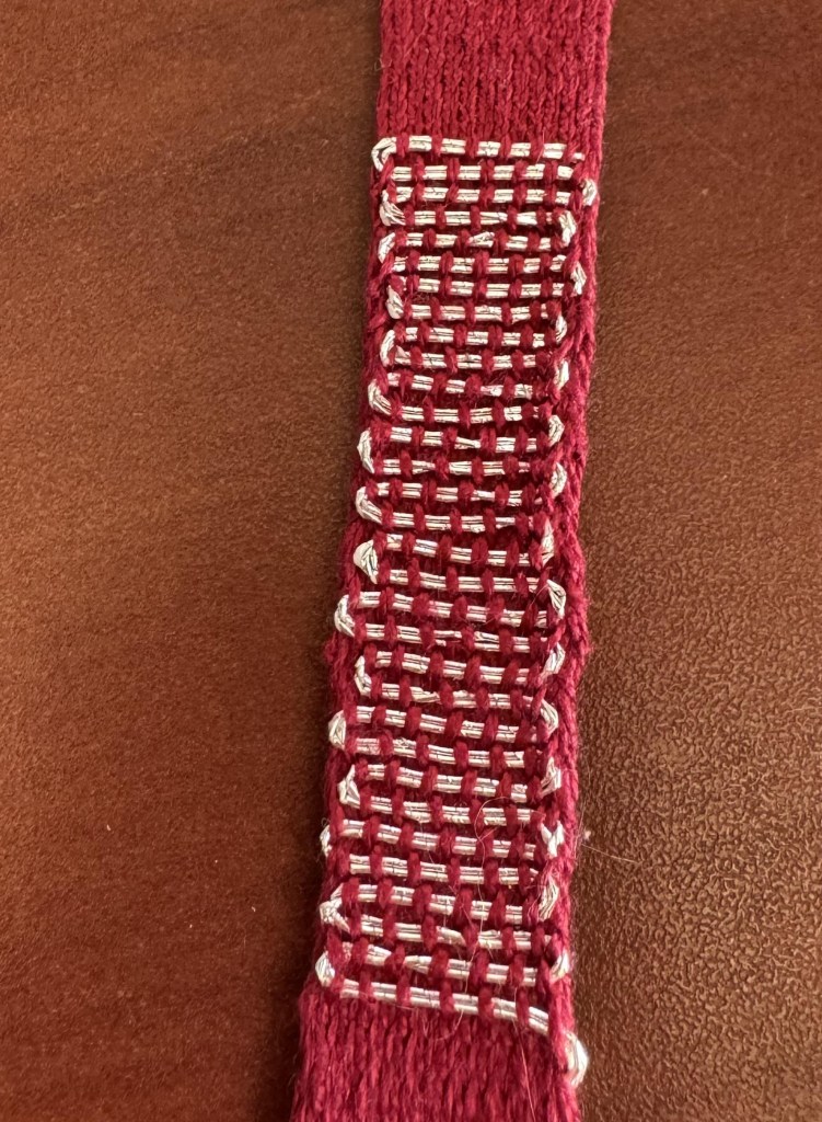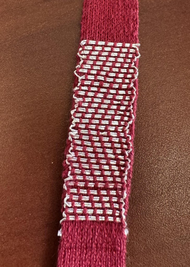Two shuttles of Krenik Japan Thread #7 were woven cross weft in a single pick brocade shed.