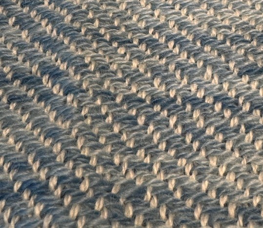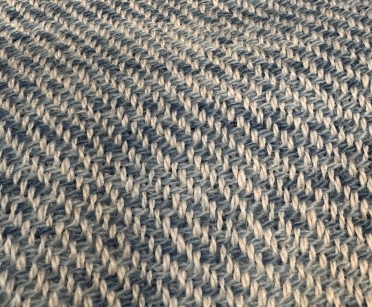This pattern shows a design that has the blue weft thread going over three warp strands, and under a fourth, creating something similar to 2/2 twill, but providing a different take on the pattern. This version is actually used still today to make denim.