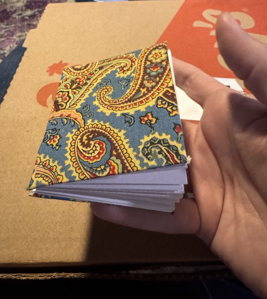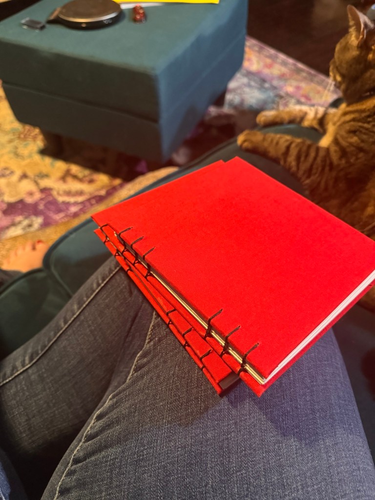 Things I learned making the third and fourth books I’ve ever made: I don’t have to get the thickest book board they make, middle of the road is fine, and fabric I have laying around the house is not ready to ‘use as is’ for the covers…