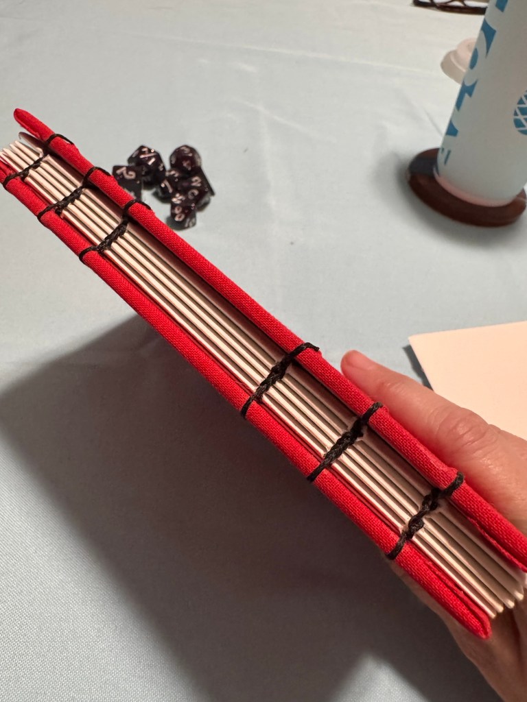 We are not gonna talk about the mess that was trying to use regular red fabric on the cover. Sufficed to say, you absolutely can use cotton for this purpose, but it requires stabilization before you glue it on. I ordered a roll of red bookcloth from Amazon, and cut it to size, clipping the corners so that it would wrap nicely.